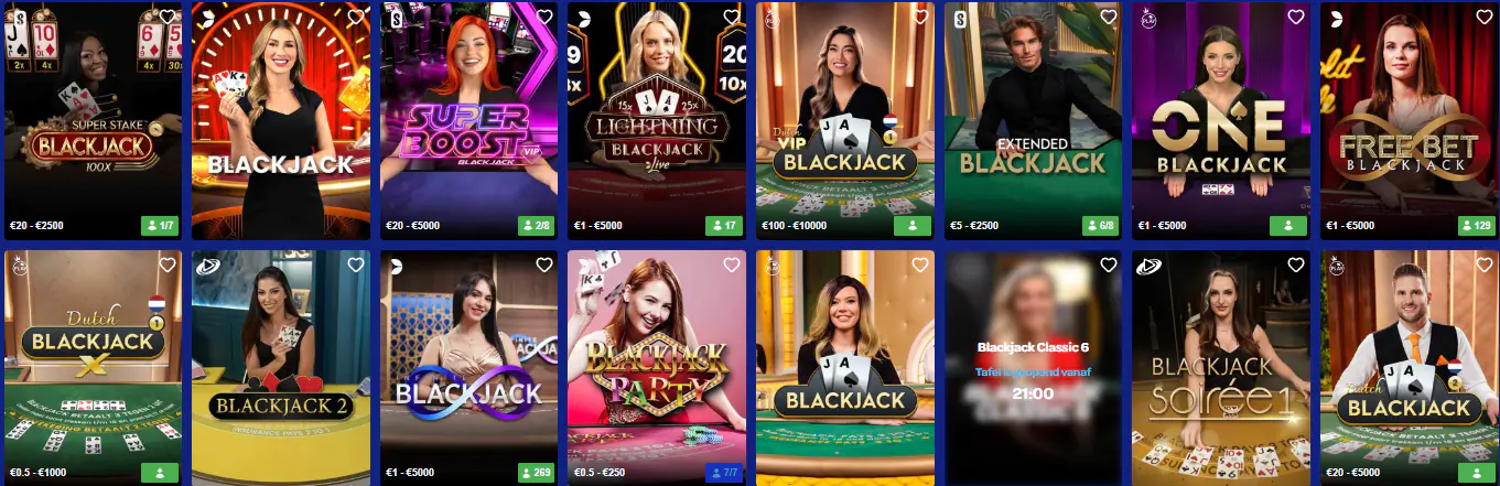 Binnen ons live casino bieden wij een uitgebreid aanbod Kansino blackjack tafels, zodat spelers altijd een tafel vinden die past bij hun ervaring en budget. In de lobby zijn duidelijk verschillende tafels te herkennen, zoals Blackjack A, B, C, D, Blackjack 1 en 2 en speciale VIP Blackjack-tafels. Het belangrijkste verschil tussen deze tafels zit in de inzetlimieten en de speelsnelheid. Bij standaardtafels beginnen de inzetten al laag, terwijl VIP-tafels hogere limieten hanteren voor spelers die grotere bedragen willen spelen. Daarnaast zijn er varianten met extra functies, zoals Bet Behind Pro Blackjack, Super Stake Blackjack en Lightning Blackjack, waar multipliers en side bets een rol spelen. Onze blackjacktafels worden begeleid door live dealers en gespeeld in realtime via een stabiele livestream. Speltip voor beginners: kies een tafel met lage minimuminzet en neem de tijd om de spelregels, uitbetalingen en beschikbare opties zoals split en double down goed te leren kennen voordat je overstapt naar hogere limieten.
