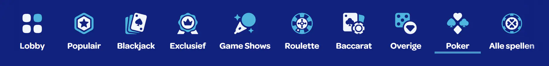 Voor spelers die op zoek zijn naar poker in het live casino bieden wij meerdere live poker varianten. Het aanbod bestaat onder andere uit Casino Hold’em en Three Card Poker, gespeeld tegen een live dealer. Deze spellen volgen vaste regels en zijn toegankelijk voor zowel nieuwe als ervaren pokerspelers.