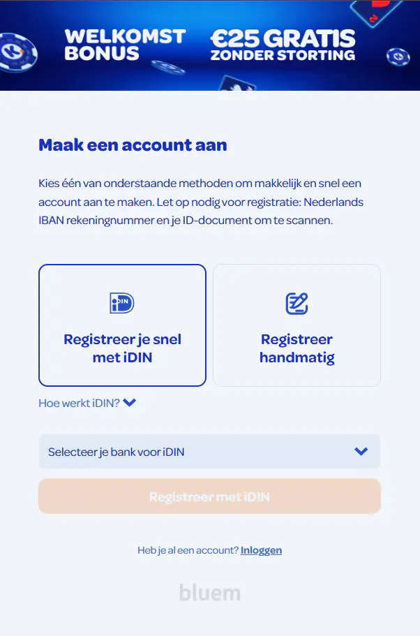Voor nieuwe spelers is registreren met iDIN de snelste en meest betrouwbare optie. Met iDIN bevestig je je identiteit via je eigen bank, zonder dat wij gevoelige bankgegevens opslaan. Het hele proces duurt minder dan een minuut en het resultaat is een volledig geverifieerd account. Zo werkt het stap voor stap: